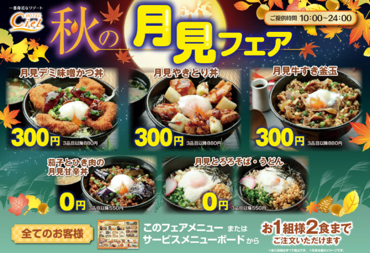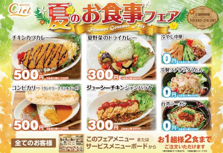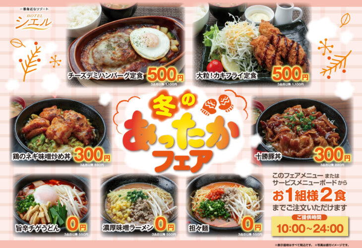 ご休憩からご利用いただける「無料食事」は、シエルグループの人気サービス。定食メニューからデザートまで多数ご用意。ご宿泊のお客様にはさらに「無料朝食」も。