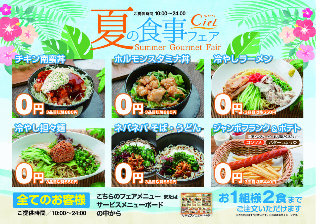 ご飲食のフェア 《終了》2024年 夏の食事フェア 2024年 夏の食事フェア こちらのフェアは終了いたしました。 ジメジメ、あつ~い夏がやってきました… そんなときは、シエルグループ「夏の食事フェア」でリフレッシュ! サクサクジューシーな唐揚げに、特製だれとタルタルソースをトッピングした「チキン南蛮丼」や、 がっつり食べたいときの「ホルモンスタミナ丼」など、計6種類をご用意。 しかも、2食まで無料! ぜひ、ご利用くださいませ♪