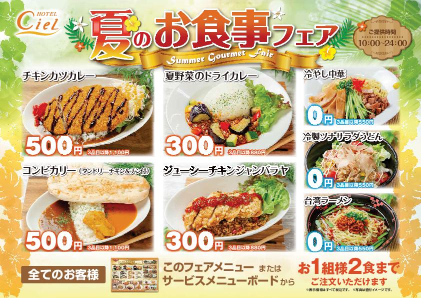 ご飲食のフェア 【終了】2025年 夏のお食事フェア 暑い夏を、さわやかに♪ ジメジメあつ~い夏がやってきました! そんな夏にピッタリのメニューを取り揃えた「夏のお食事フェア」がスタート! 食べ応え◎のチキンカツカレー、彩り豊かで見た目も楽しい夏野菜のドライカレーや、 その他さっぱりメニューもご用意しております。 すべてのお客様に2食まで「500円 or 300円 or 無料」でご利用いただけます。 ぜひ、シエルグループの夏のお食事フェアで、爽やかな夏をお過ごしください♪