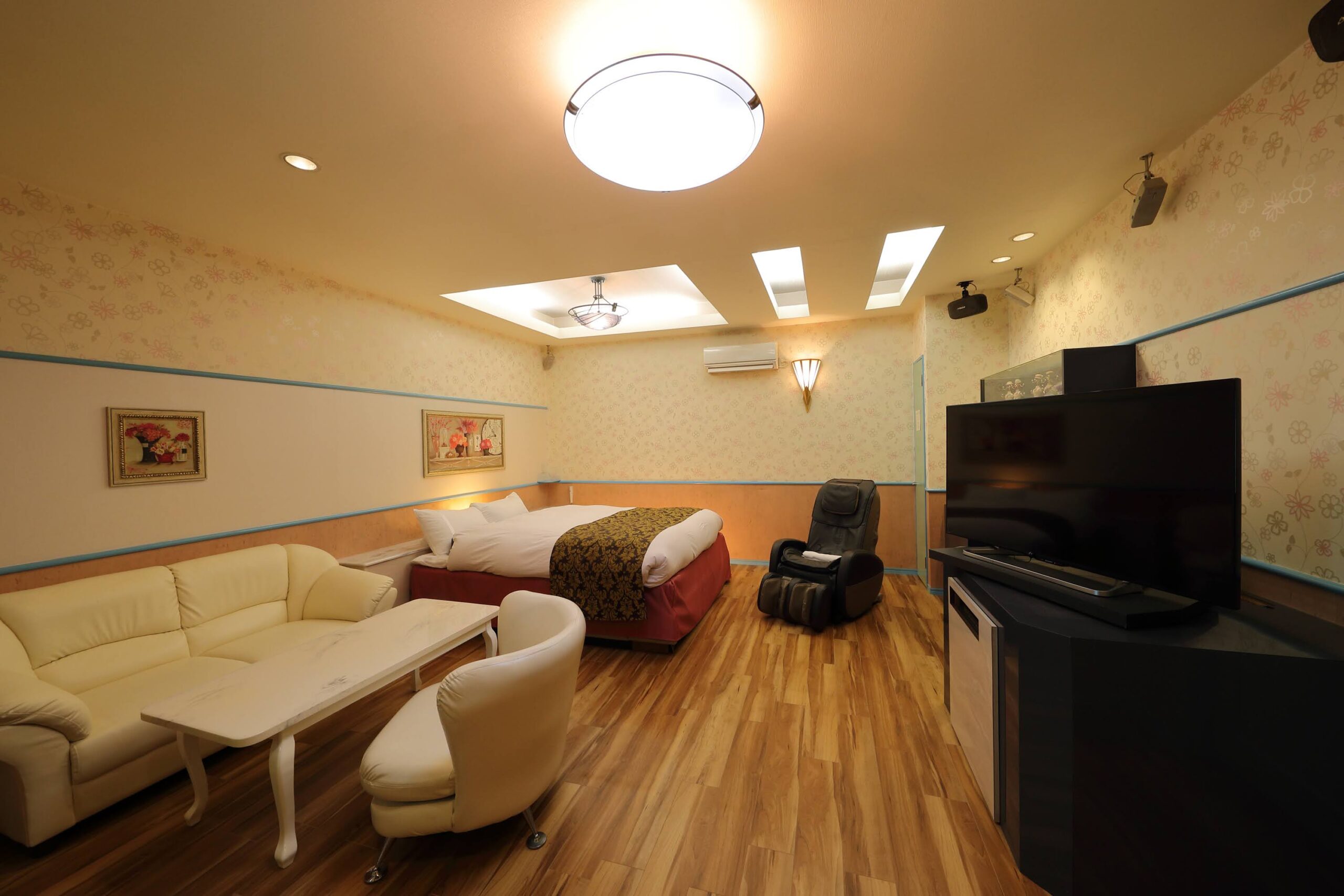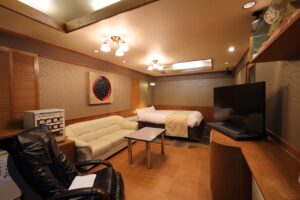 広々とした開放的な空間には、ダブルベッドが2台にマッサージチェア2台を完備。